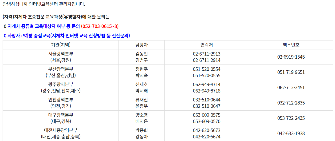 사망사고예방중점교육, 기본교육 등 담당자 연락처 안내 안녕하십니까 인터넷교육센터 관리자입니다. (자격)지게차 조종전문 교육과정(유경험자)에 대한 문의는 0 지게차 종류별 교