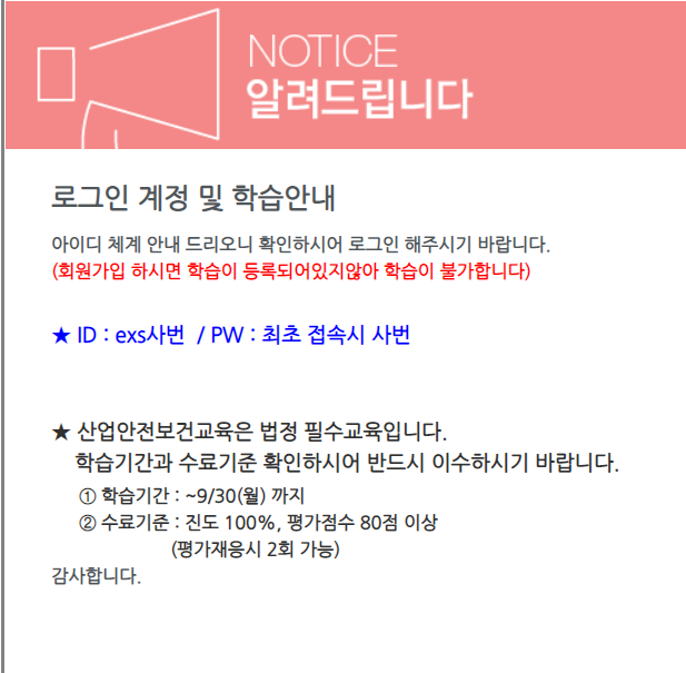 산업안전보건교육은 법정 필수 교육 입니다. 반드시 학습기간과 수료기준 확인하시어 이수하시기 바랍니다.