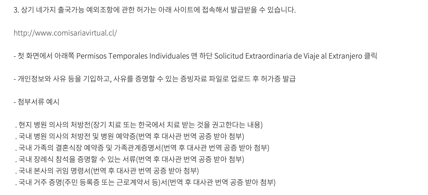 전세계에서 백신이 보급되면서 해외여행이나 개인사정에 의한 입국을 생각하시는 분들이 많겠지만 현재 칠레는 외국인에 대한 입국이 금지되어 있습니다. 다만 비거주외국인이 칠레를 떠나는 출국은 가능합니다. 반대로 칠레인들과 거주외국인은 출국이 금지되고 입국은 가능합니다. 다만 반드시 칠레를 떠나야 하는 이유가 있거나 인도적 사유와 질병치료 공무 다시 칠레로 돌아올 계획이 단기간에 없는 경우는 예외적으로 출국이 가능합니다.