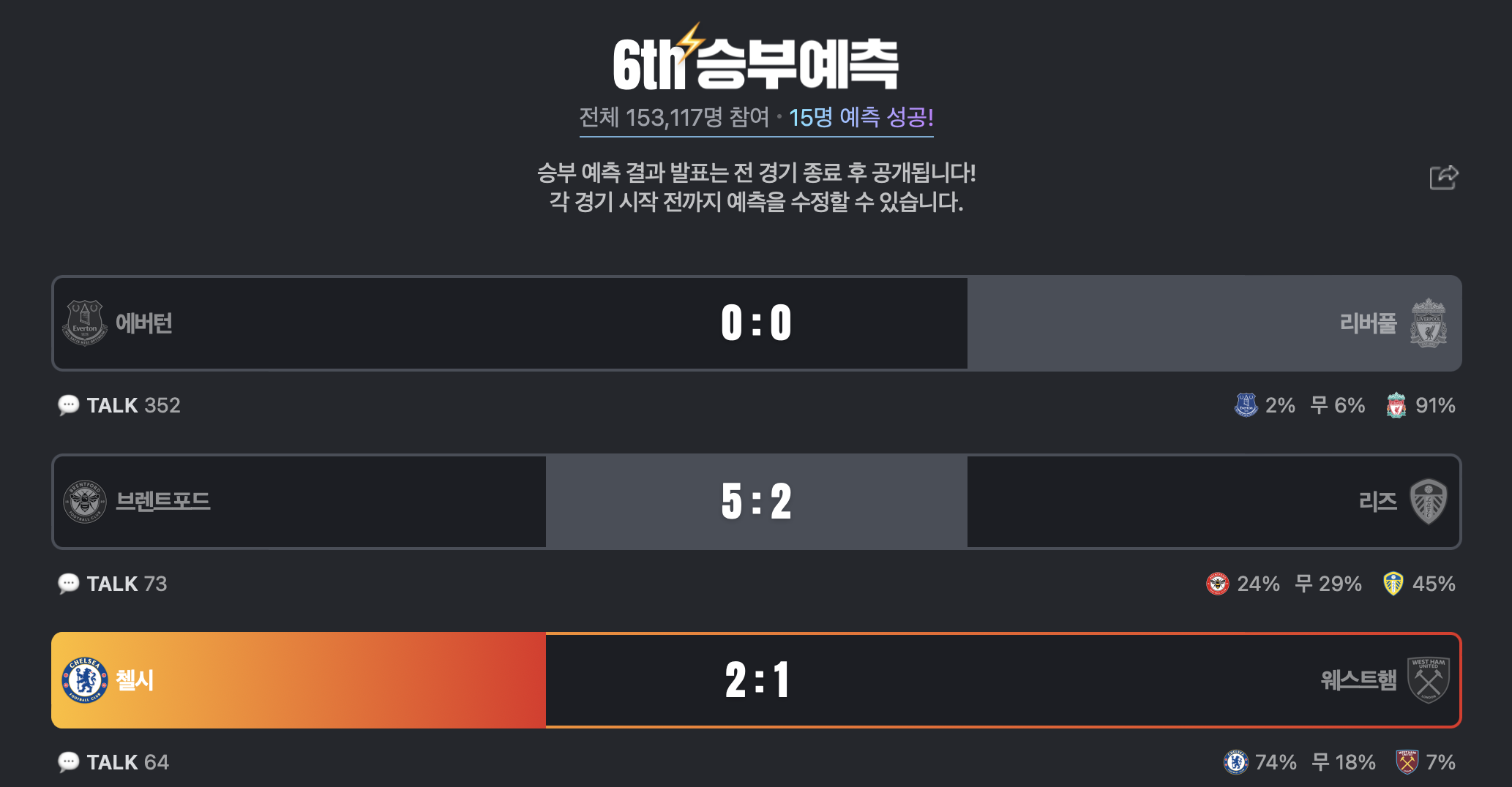 5회에서는 사우스햄튼이 첼시를 잡는 바람에 만들어진 기록이고 이번 6회차는 1경기 에버튼과 리버풀의 머지사이드더비가 0-0으로 비기면 벌어진 대 참사다.