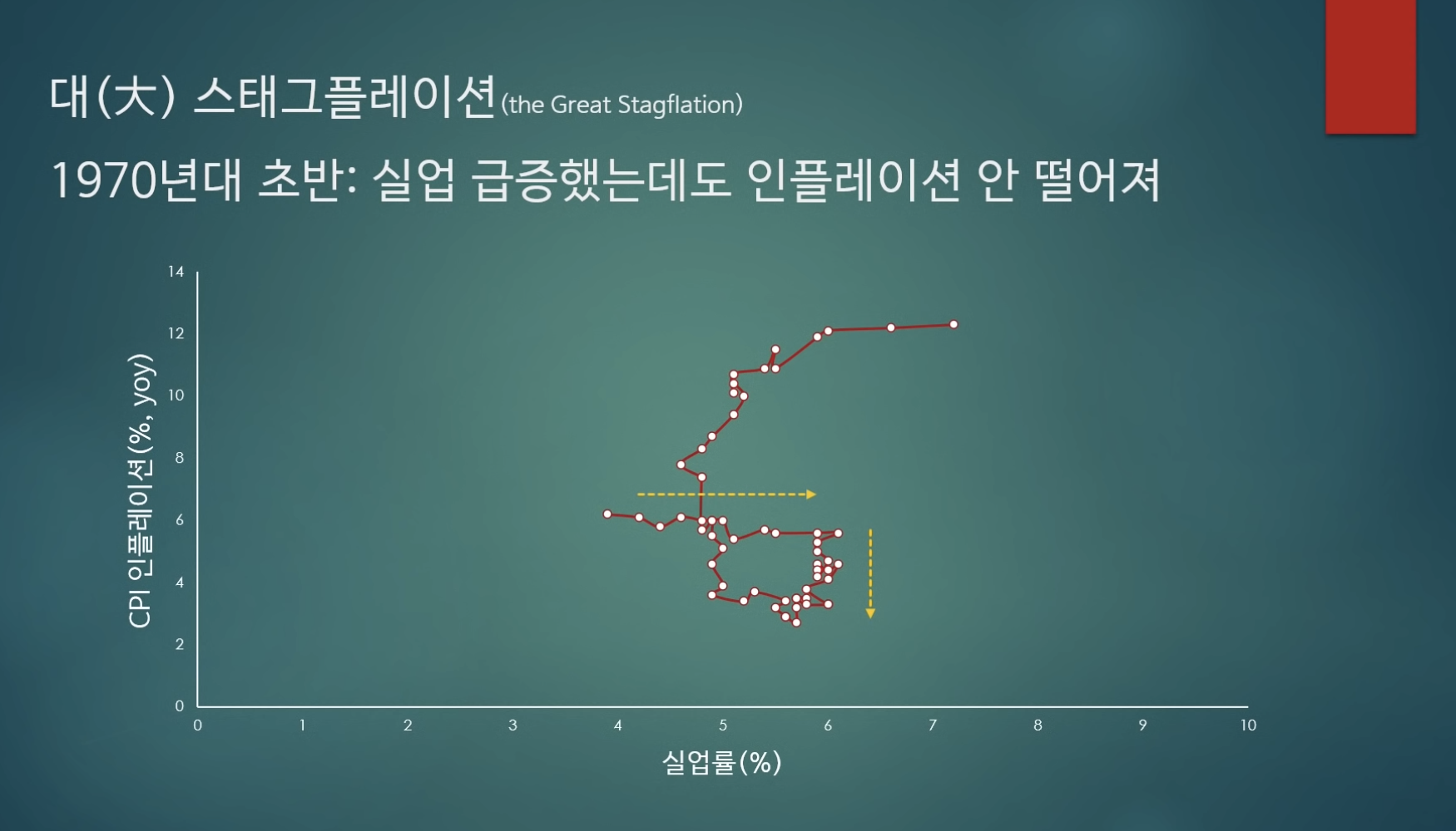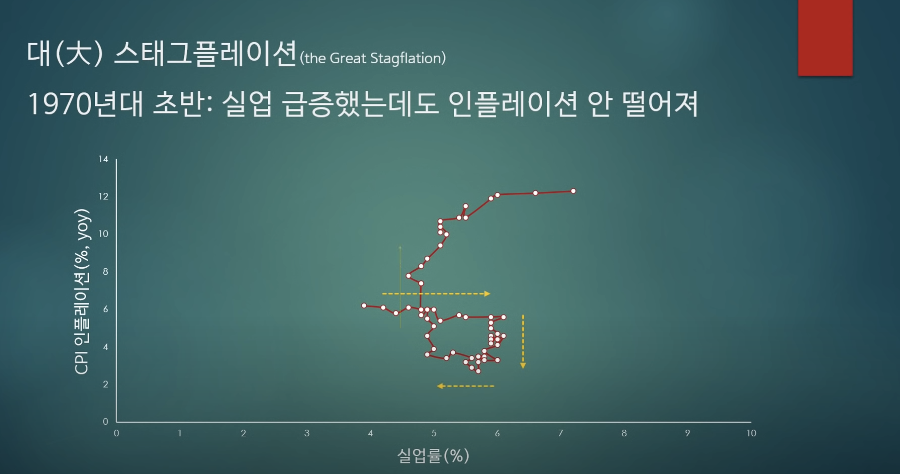 문제는 인플레이션이 너무 높다보니 실업률을 조정해서 실업이 급증했는데 떨어져야 하는 인플레이션이 떨어지지 않는 현상이 발생함.