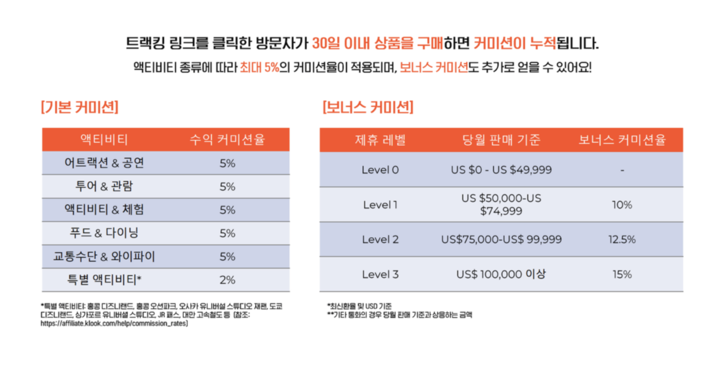 클룩이라고 여행 액티비티 예약 사이트인데 여기도 쿠팡파트너스처럼 제휴회원 어필리에이터코드가 있는 링크를 통해서 결제를 하면 매출액의 2% - 5%를 수익금으로 주는 파트너프로그램을 운영하고 있네요.