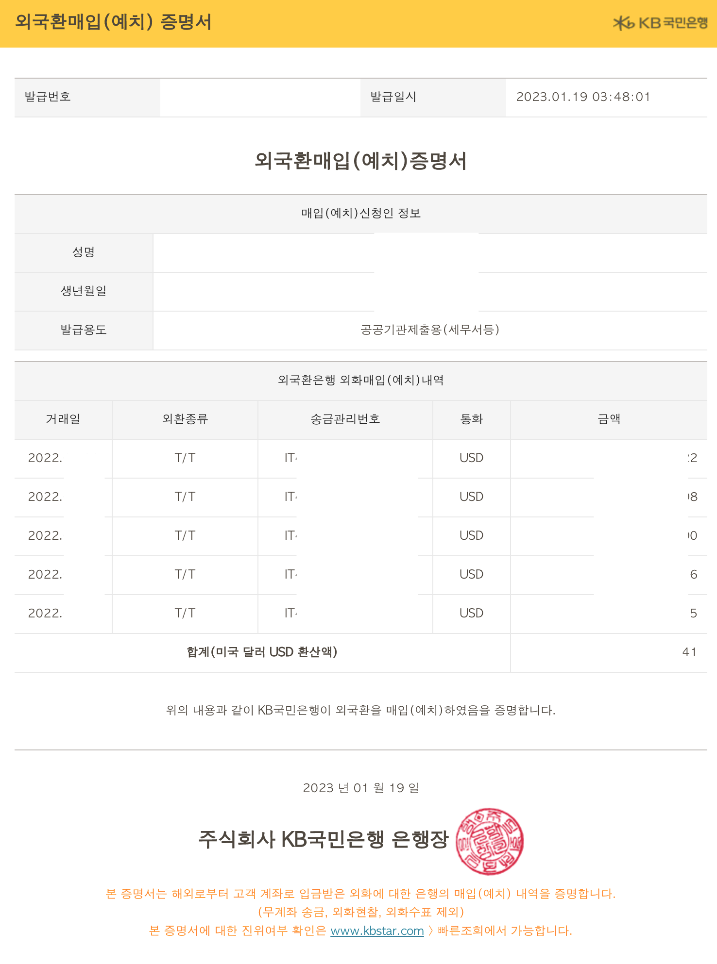이렇게 해서 국민은행에서는 내가 받은 외화송급내역을 쉽게 발급할 수 있습니다. 근데 솔직히 이게 뭐라고 다른 은행들은 인터넷으로 발급을 못하게 막아두고 있고, 기업뱅킹 가입을 하면 가능하다고 안내를 하거나, 직접 영업점을 방문해야 한다고 안내합니다.