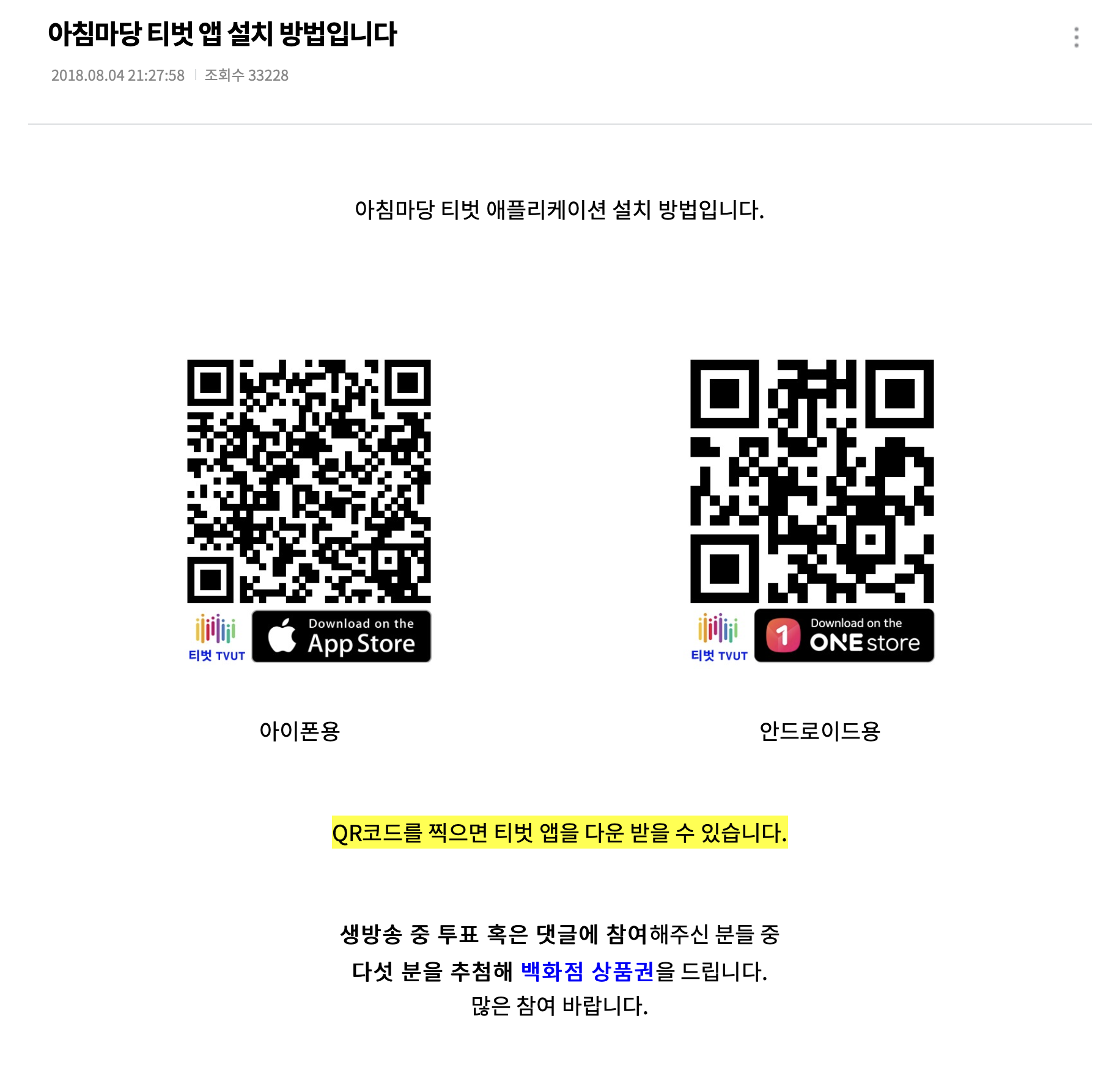 이 퀴즈를 티벗 앱에서 참여하시면 추첨을 통해 백화점 상품권 5만원 ~ 10만원권을 증정합니다.