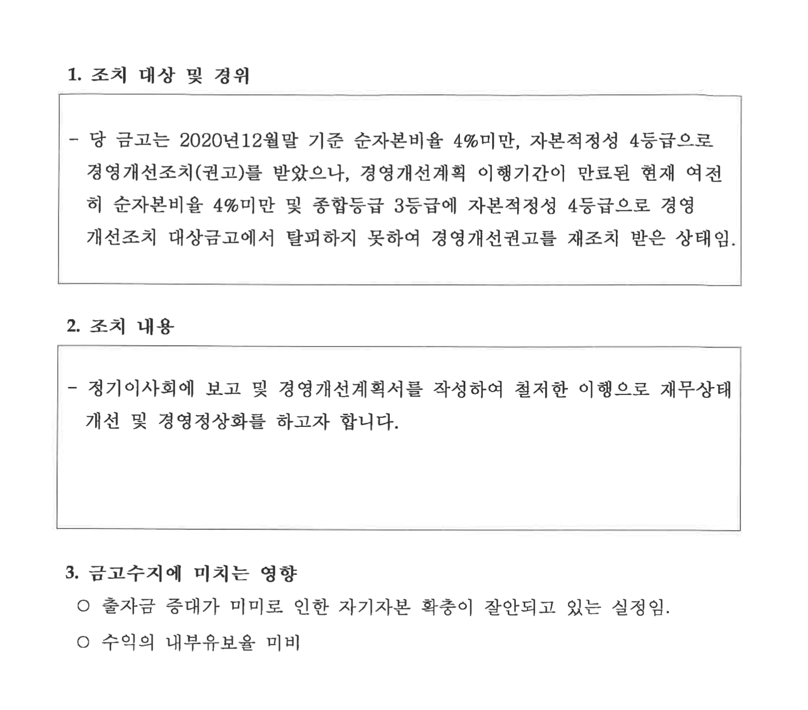 이런식으로 수시공시의 이유를 알리는데 조치대상 및 경위에 새마을금고 감독기준 제 12조 제1항 제2호 경영실태평가결과 종합평가등급이 1등급 내지 3등급으로서 자본적정성 또는 자산건전성 부문의 평가등급을 4등급 또는 5등급으로 판정받은 경우에 해당하여 경영개선권고를 받음이라는 안내와 조치내용이 나오고 있습니다.