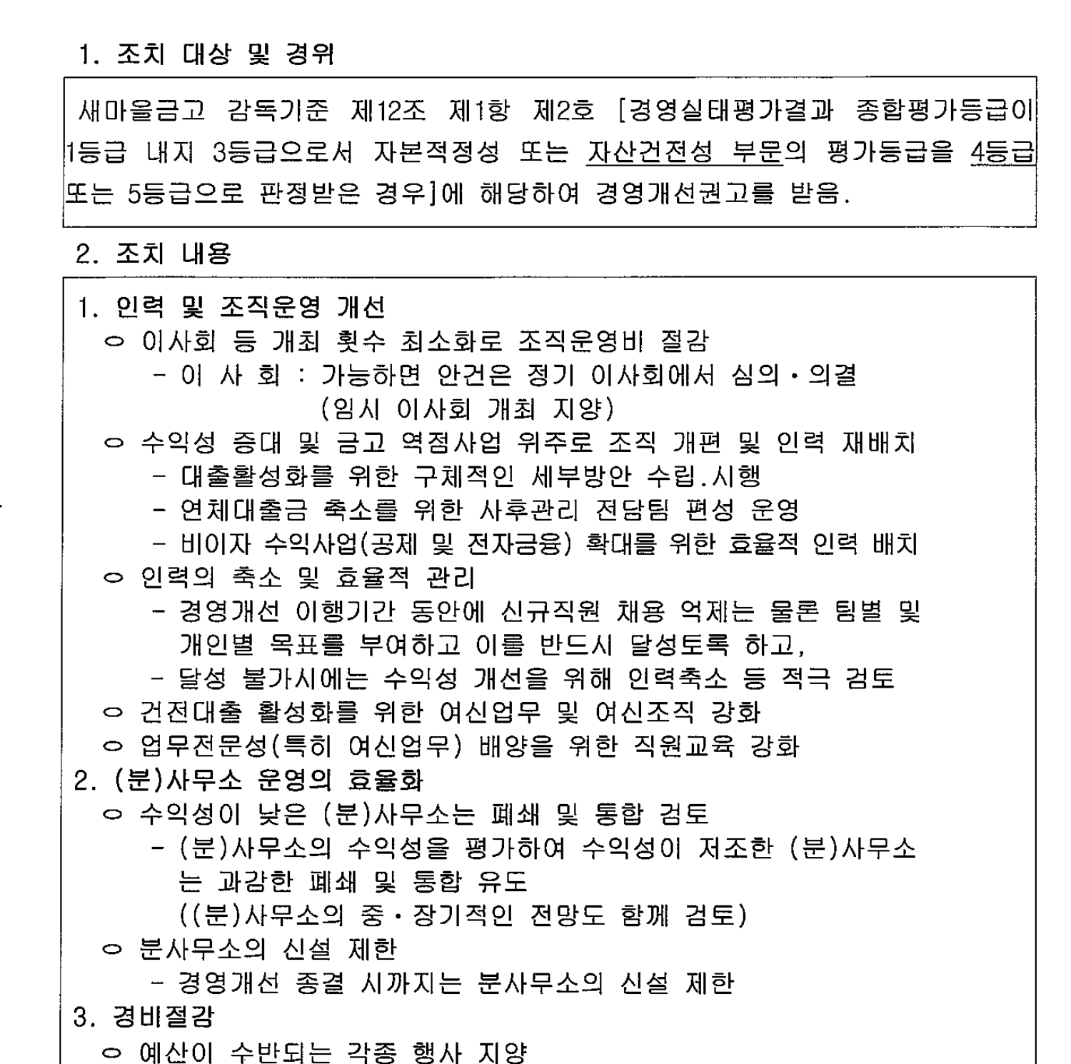 조치 내용은 거의 대동소이한데 인력 및 조직운영 개선, (분) 사무소 운영의 효율화, 경비절감 등의 사항입니다.