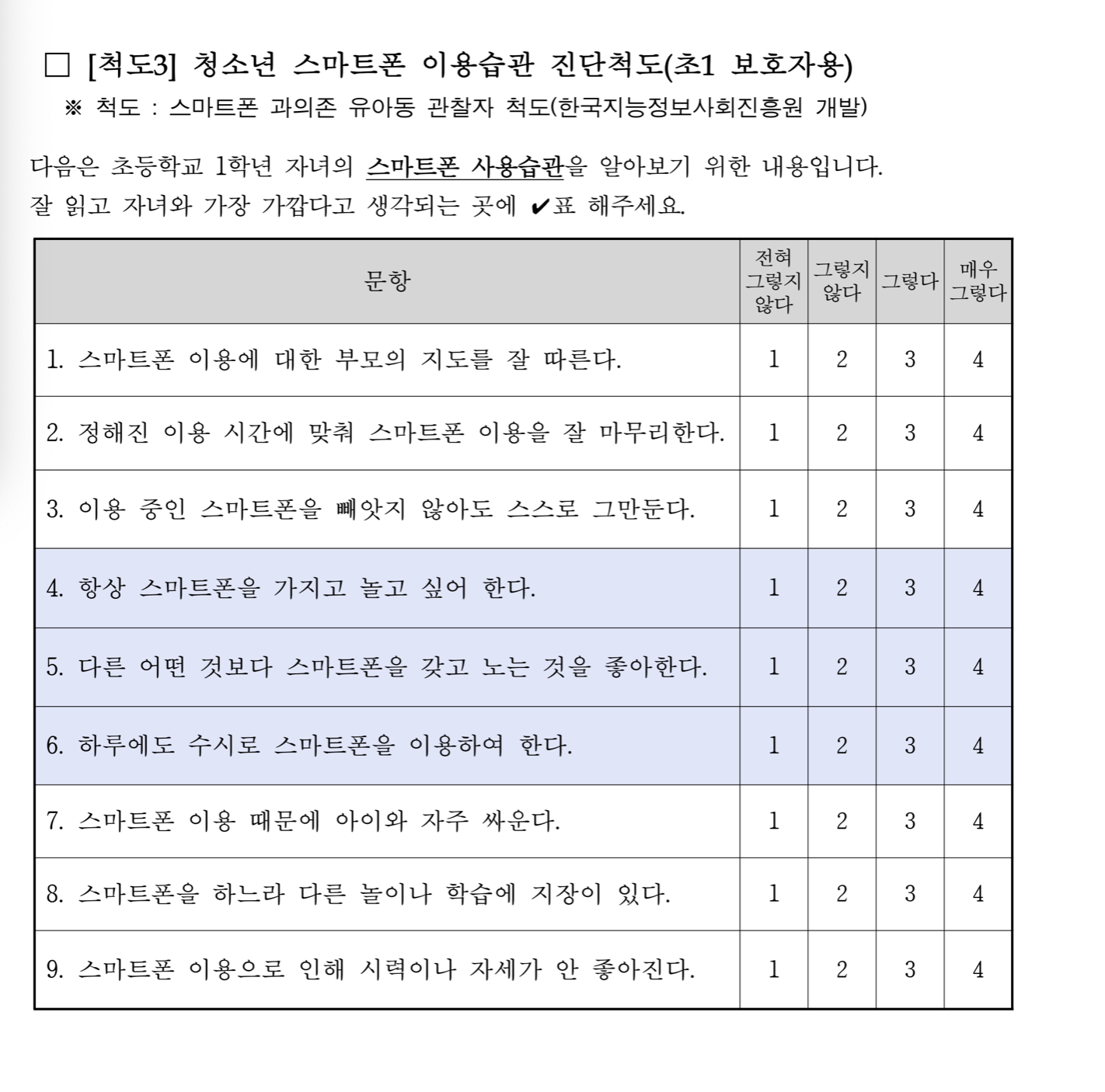 초등학교 1학년생 자녀를 둔 학부모 혹은 보호자가 최근 3개월여동안 관찰한 인터넷, 스마트폰 과의존 관찰자진단문항을 응답해주시면 됩니다.