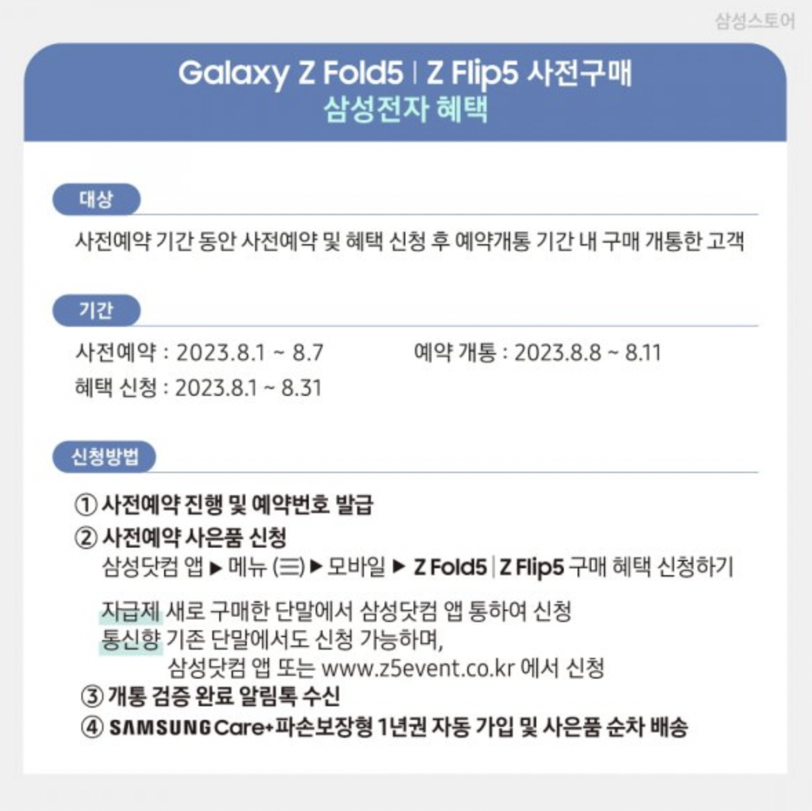 통신향 : 기존 단말에서도 신청 가능, 삼성닷컴 앱 또는 www.z5event.co.kr 접속해서 신청