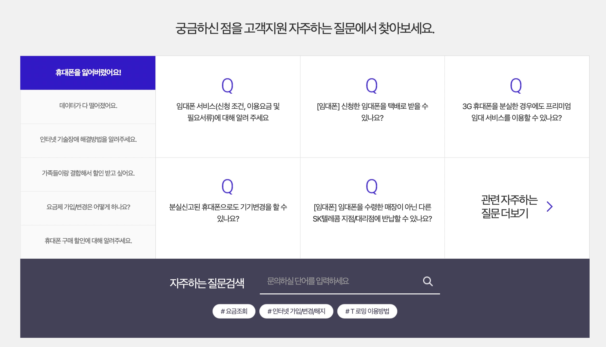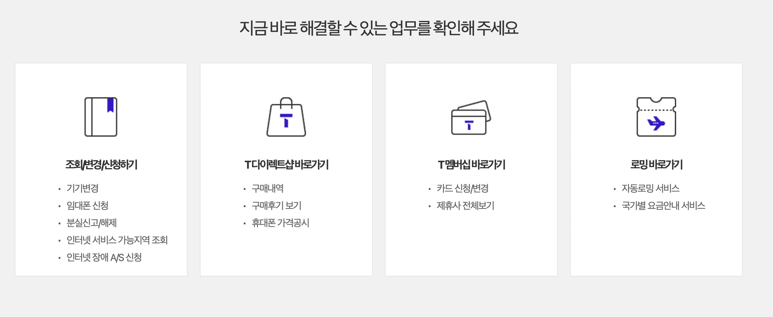 조회/변경/신청 (기기,임대폰,분실신고해제, 인터네섯비스가능지역조회, 인터넷장애A/S)