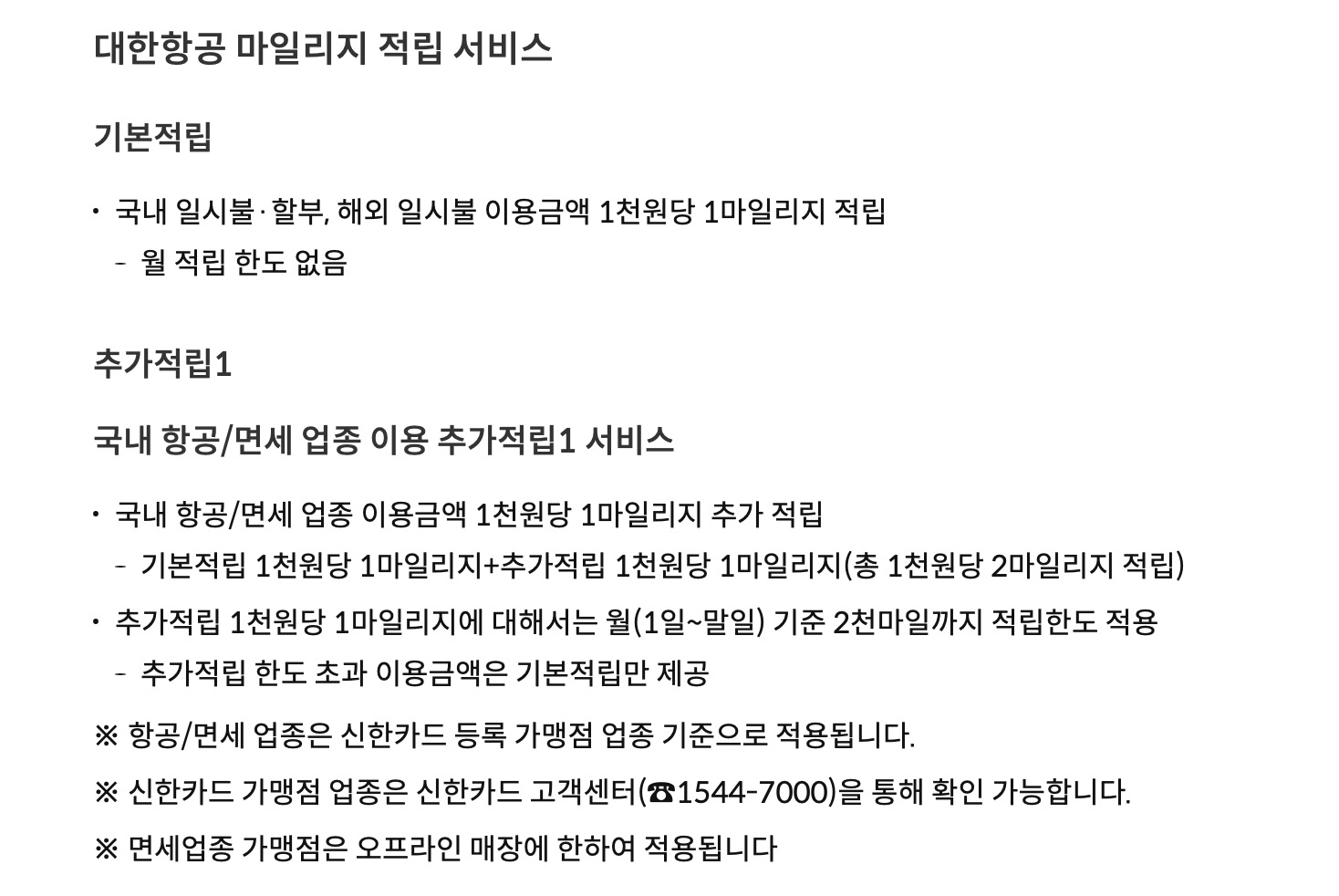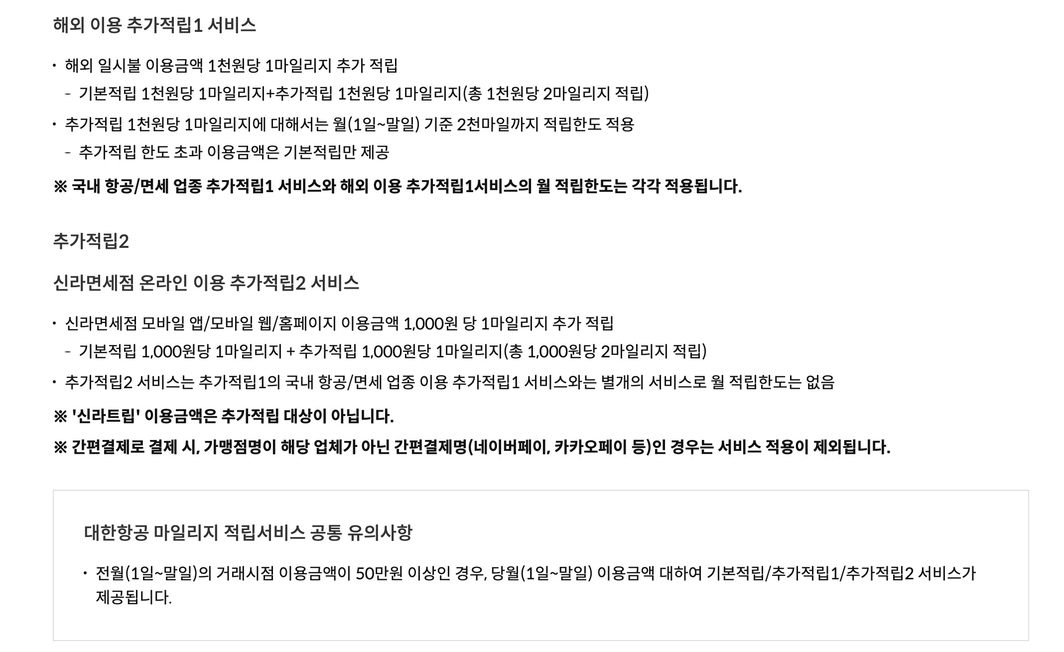 다만 실제로 국내항공/면세 업종을 이용하시는 경우 기본적립 1천원당 1마일리지에 더해서 추가로 1천원당 1마일리지가 더 적립됩니다. 다만 한도는 월 2천마일까지 입니다.