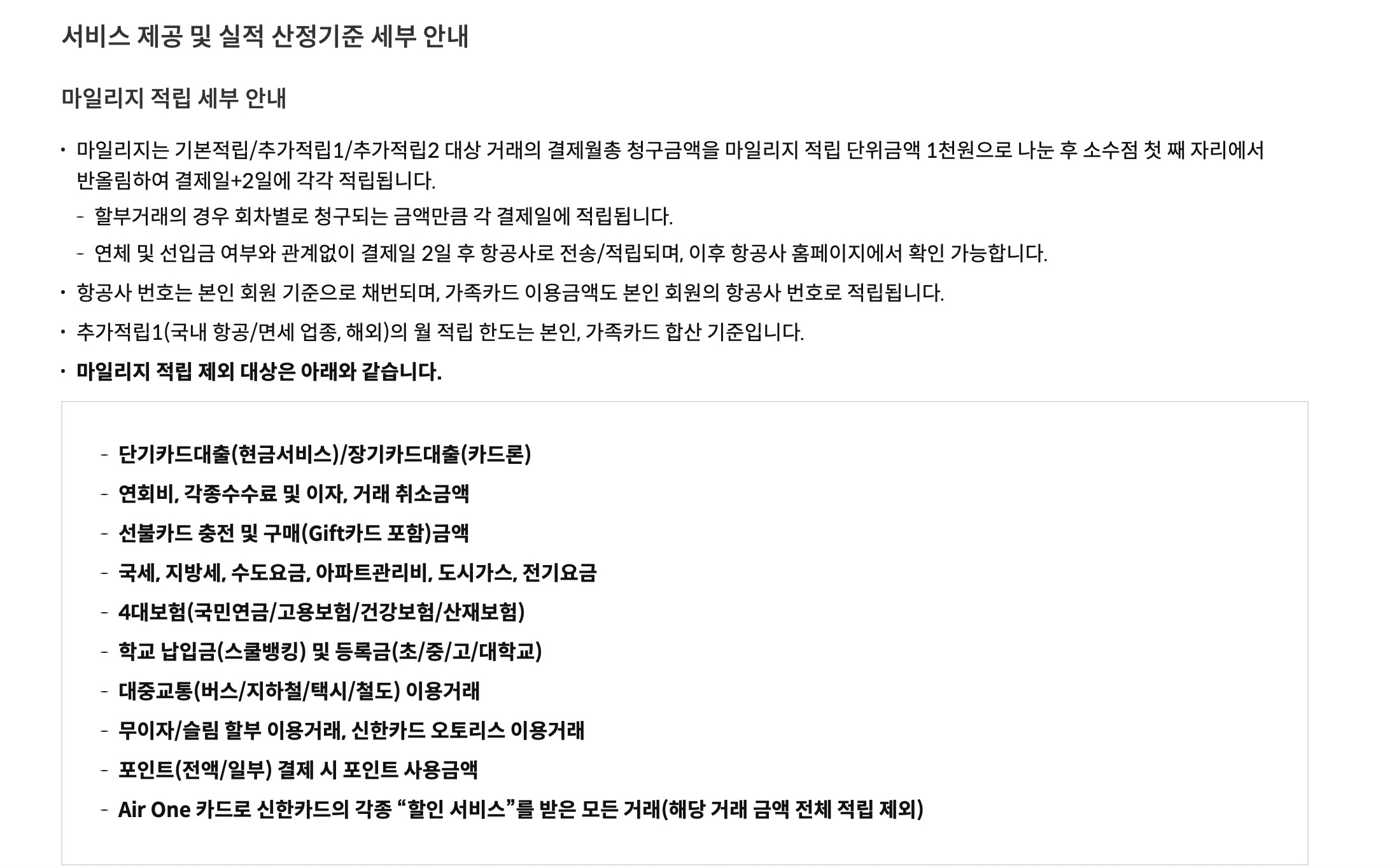 서비스 제공 및 실적 산정기준을 잘 보시면 마일리지 적립 대상 제외 안내가 되어있습니다.