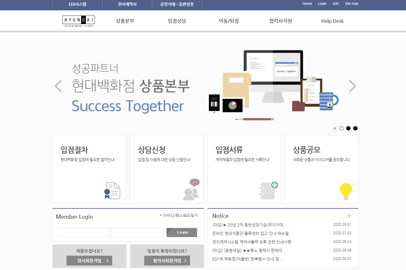 현대백화점 상품본부 첫 페이지 상단에 있는 EDI시스템 링크를 클릭하시면 됩니다.