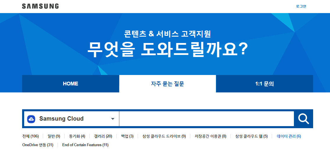 일반, 동기화, 갤러리, 백업, 삼성클라우드 드라이브, 저장공간 이용권, 삼성클라우드 웹, 데이터관리, OneDrive 연동, End of Certain Features 총 106개의 질문과 해결방법이 소개되어 있습니다.