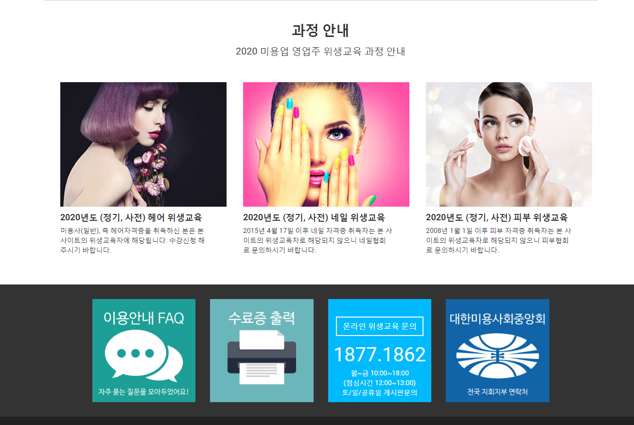 2020년도 정기 헤어, 네일, 피부 위생교육 온라인 신청 및 수강 페이지 입니다. 사단법인 대한미용사회중앙회 위생교육 사이트를 통해 수강료 3만원을 결제하고 수강하실 수 있습니다.